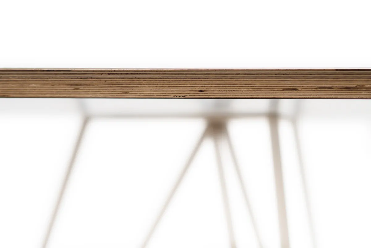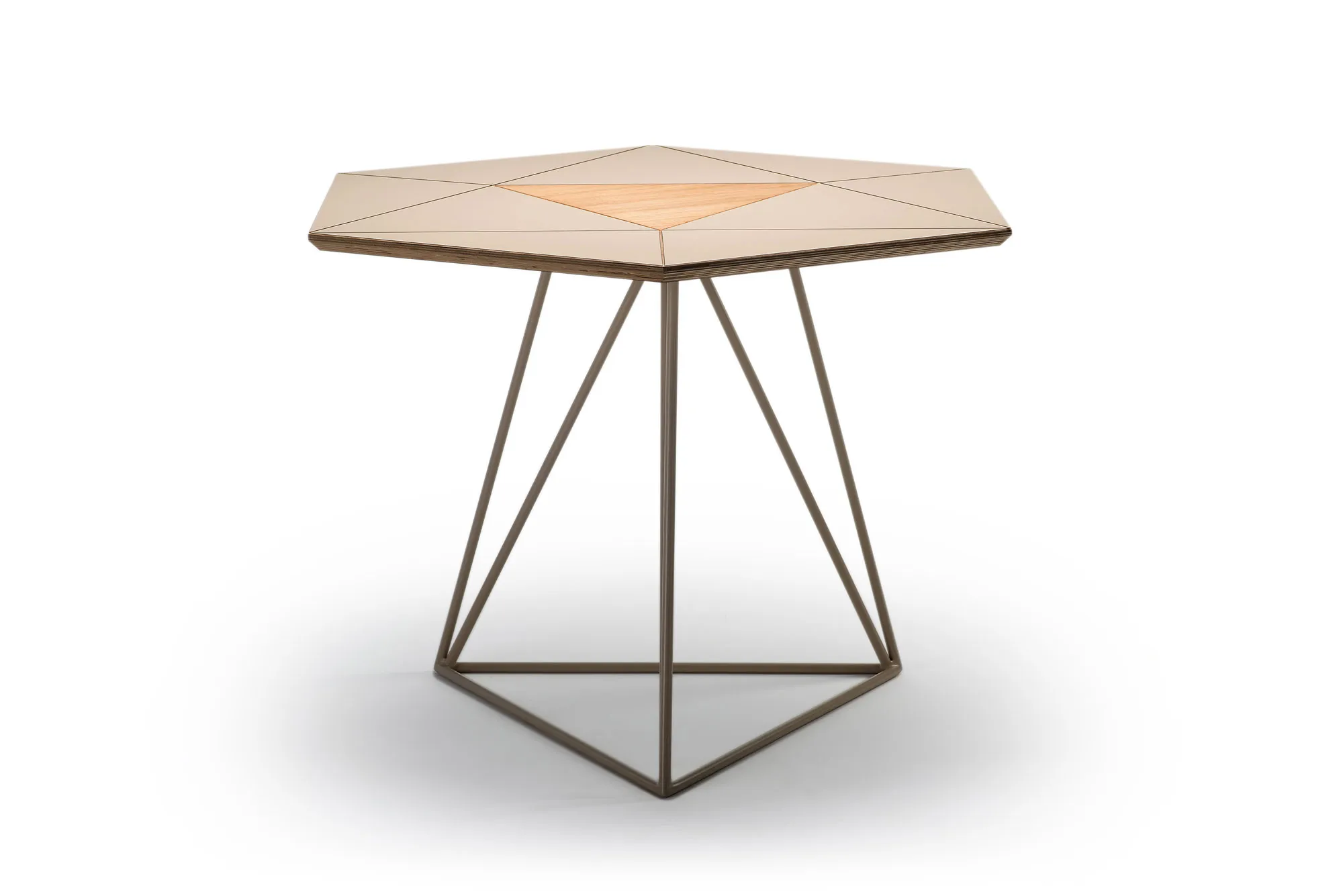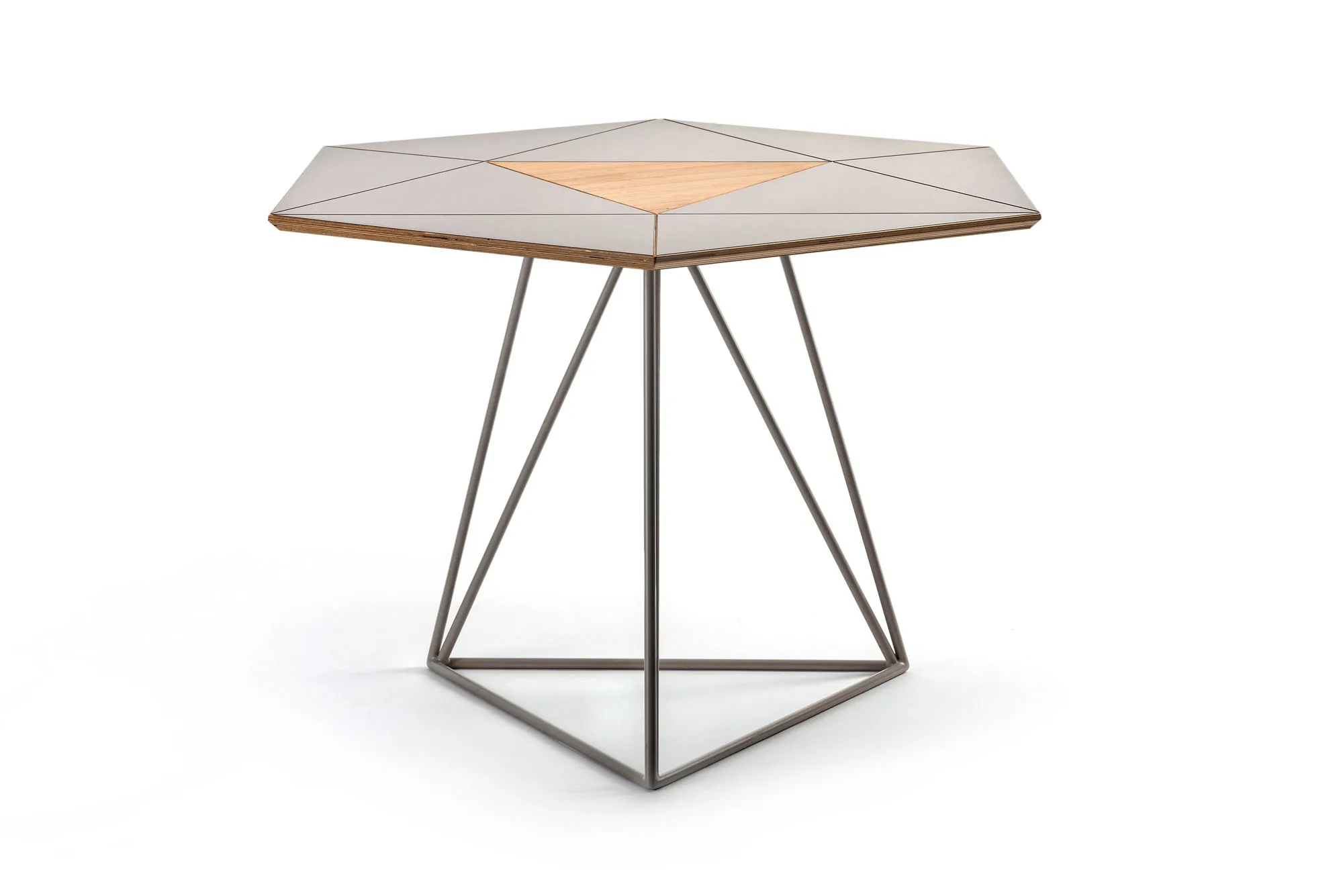 The form of a counter is a composition based on triangles in the color of steel base, with an equilateral triangle made of oak in the middle of it. Thanks to hexagonal shape of the counter even 6 people can sit at.